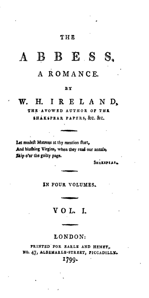 We’ve all heard of Matthew Lewis’ The Monk (1796) as the height of salacious and gasp-inducing Gothic in the 1790s but Ireland’s The Abbess gives it a run for its money. The supernatural thrills of The Monk (bleeding spectral nun!) are absent from The Abbess but replaced with extra scenes of inquisitional torture. As the title suggests, the libidinous villain of this novel isn’t a rampaging monk or nobleman but rather the Abbess Vittoria Bracciano. She uses her position as Abbess to ferry young men in for scandalous sexual exploits but Marcello is immune to her wiles. He has other to fish to fry after seeing the beautiful Maddalena, but that only leads to a series of increasingly unfortunate events for both our young protagonists. Scandalous, salacious and lurid in its depictions of sex and torture, The Abbess will appeal to those whose taste in the Gothic runs more towards The Monk than The Mysteries of Udolpho. Please be aware, that, like The Monk, it includes a rape, this time of our young male protagonist.